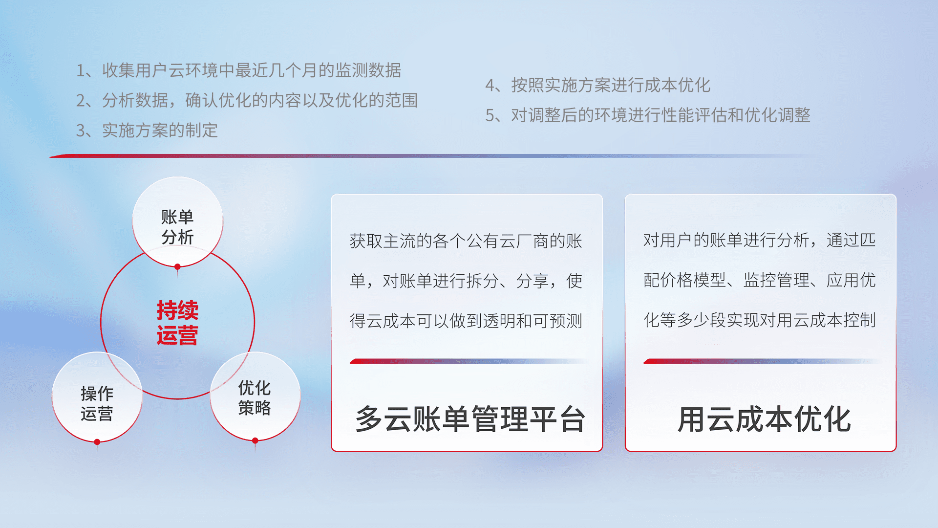 通过多云纳管,,,以统一的资源数据模型把客户的云资源进行抽象和封装,,,进而实现对多云资源的统一操作,,,,保障云资源管理的可靠性、、稳定性与可用性。。。量身定制化运维内容,,,,配置、、开发运维、、补丁管理、、、备份、、、监控、、、认证和访问管理、、、审计和日常巡检等,,,保障在用云过程中的可靠度,,,,稳定度以及高可用率。。